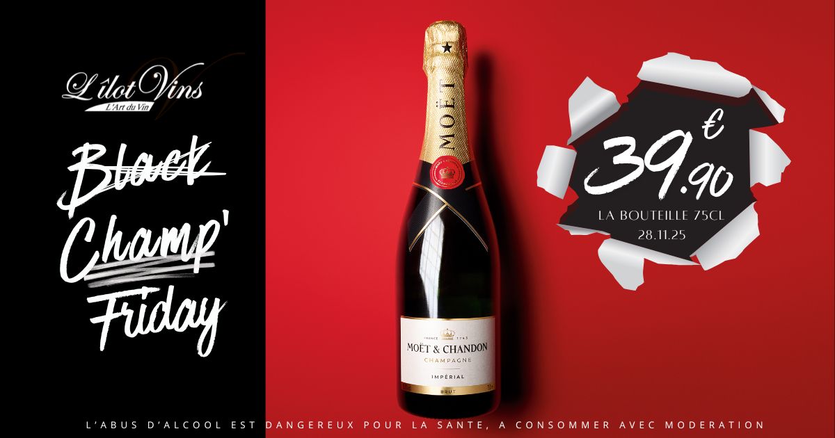 À l’occasion du Black Champ’ Friday, L’Îlot Vins vous propose une offre exceptionnelle : la bouteille de champagne Moët & Chandon Impérial Brut à 39,90 €, uniquement ce vendredi, dans les 4 caves. Une opportunité rare de vous offrir un champagne de prestige à un prix spectaculaire.